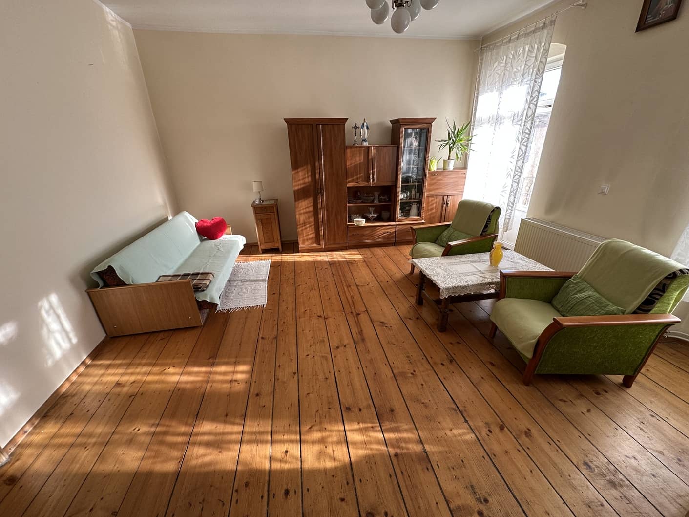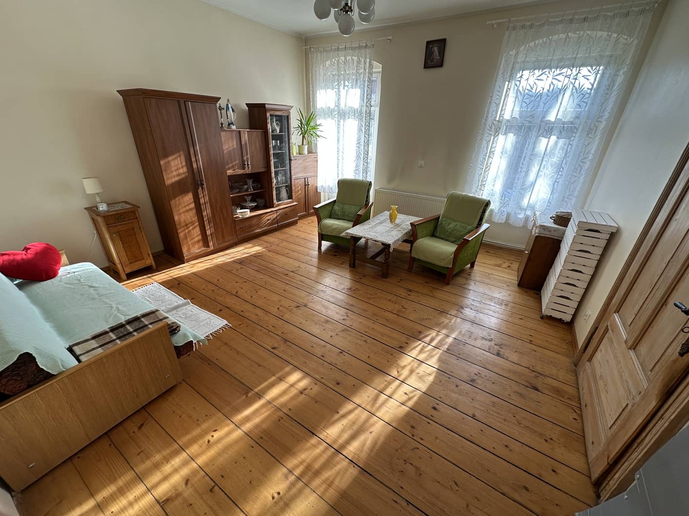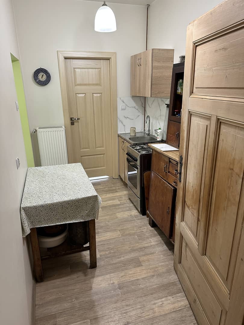 Mieszkanie bardzo klimatyczne, właściciel pozostawił piękne stare deski na podłogach (w mniejszym pokoju i w kuchni są przykryte wykładziną PCV), odrestaurował piękne stylowe drewniane drzwi.