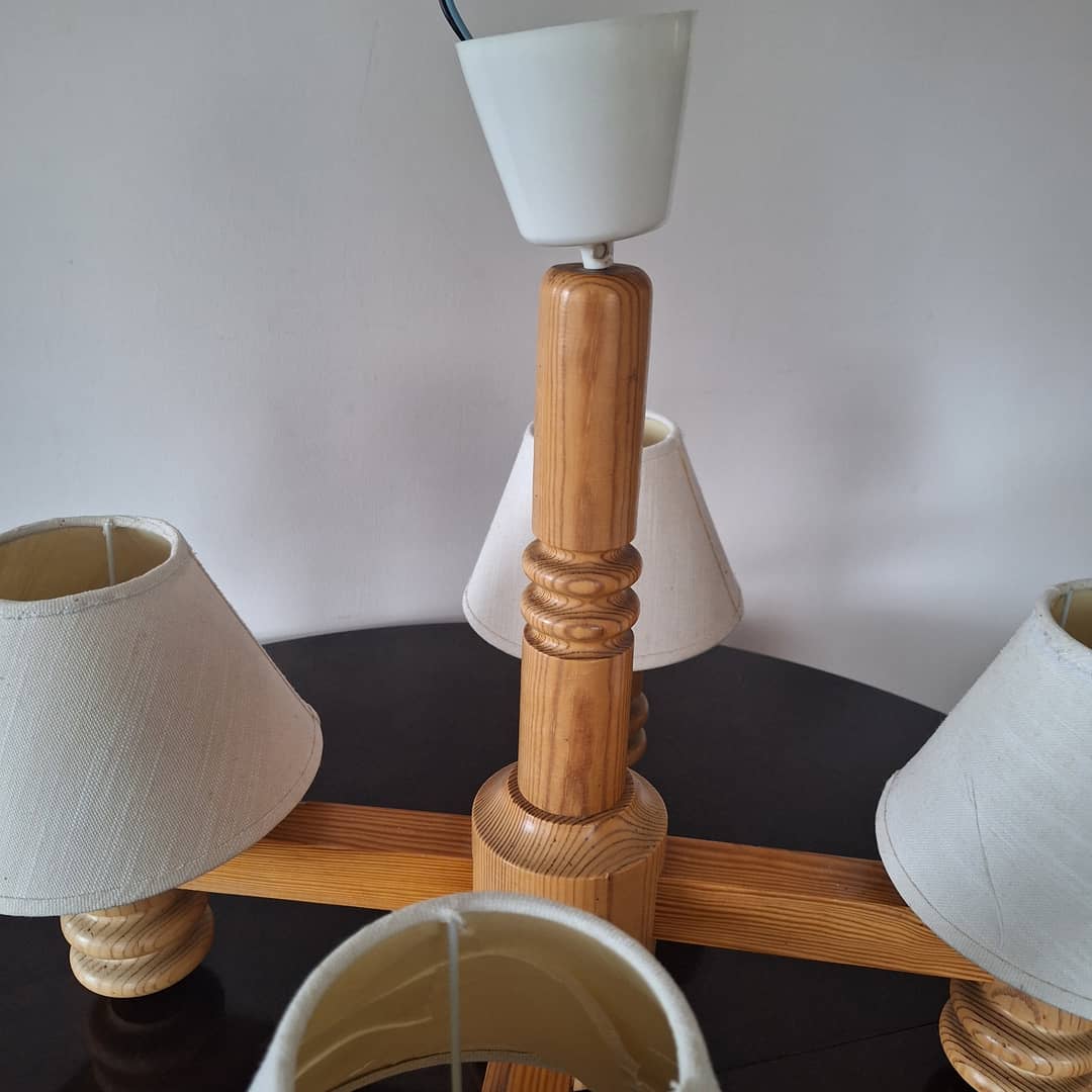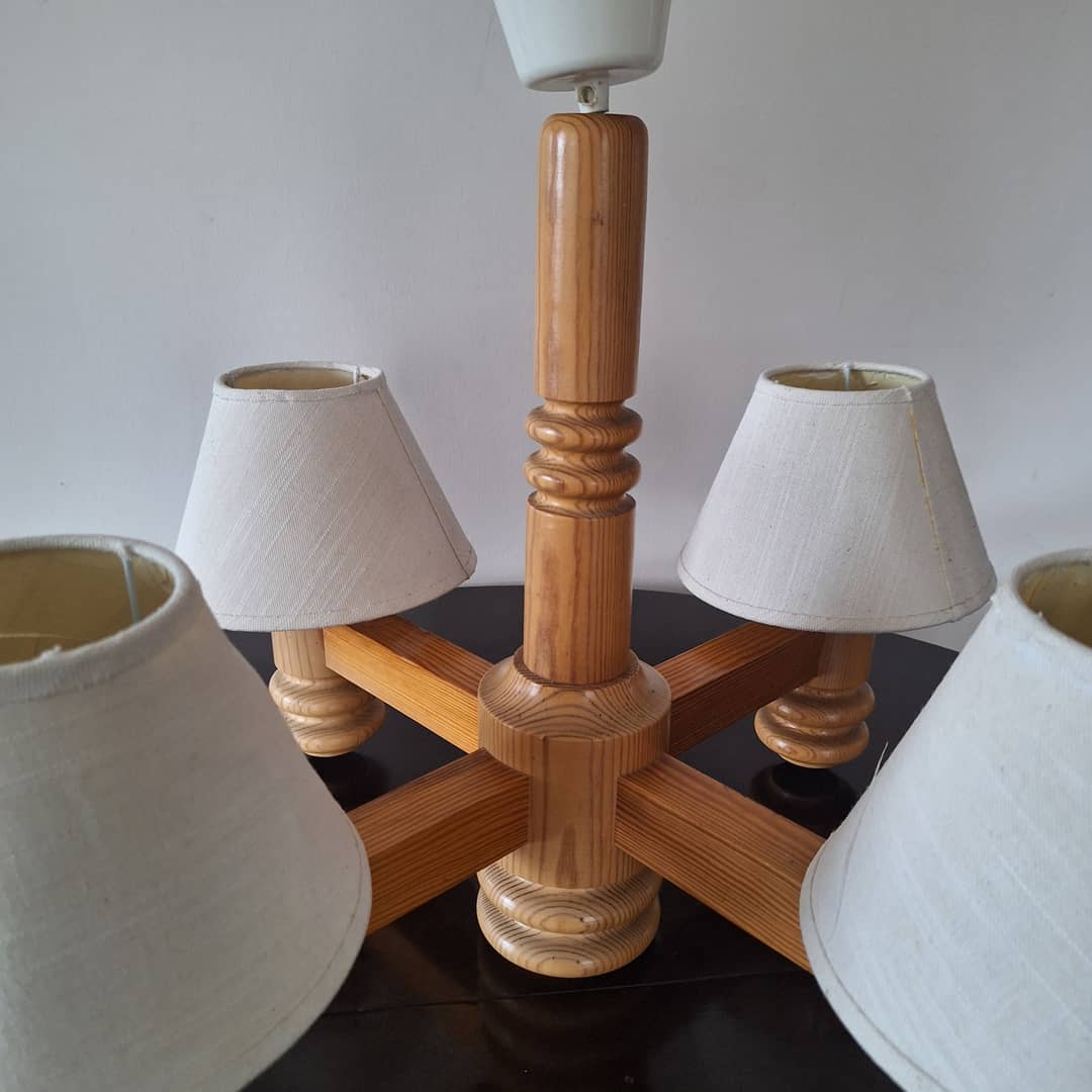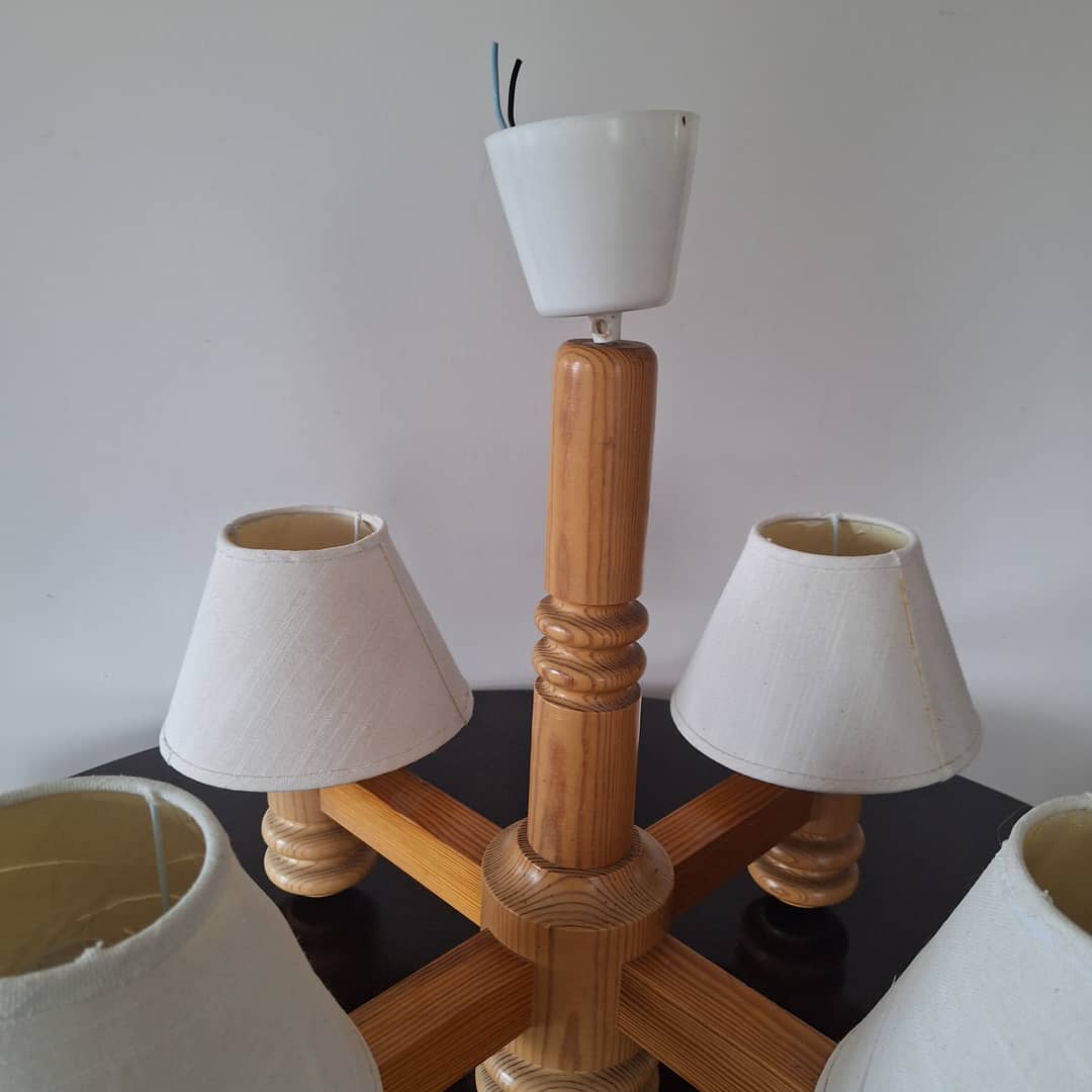 Żyrandol drewniany w dobrym stanie, średnica 62 cm, w komplecie 4 żarówki, możliwy dowóz . Cena 90 zł.